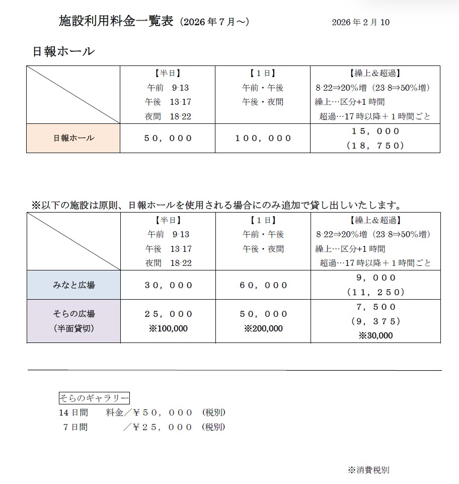 なお、既にご予約済みのご利用分につきまして、令和8年6月30日(火)までに正式に利用申請書を提出し、承認された場合は施設利用料金のみ旧料金を適用いたします。ただし、備品貸出料金および7月1日以降のご利用日の変更や追加は新料金を適用します。